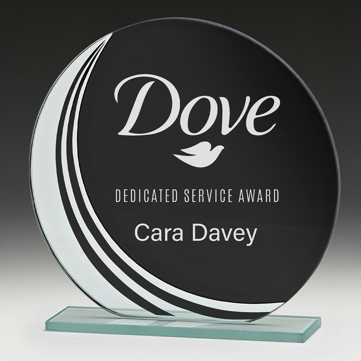 The circular Avalon series of budget glass awards will perfectly show of your engraving together with a stylish black & silver design.