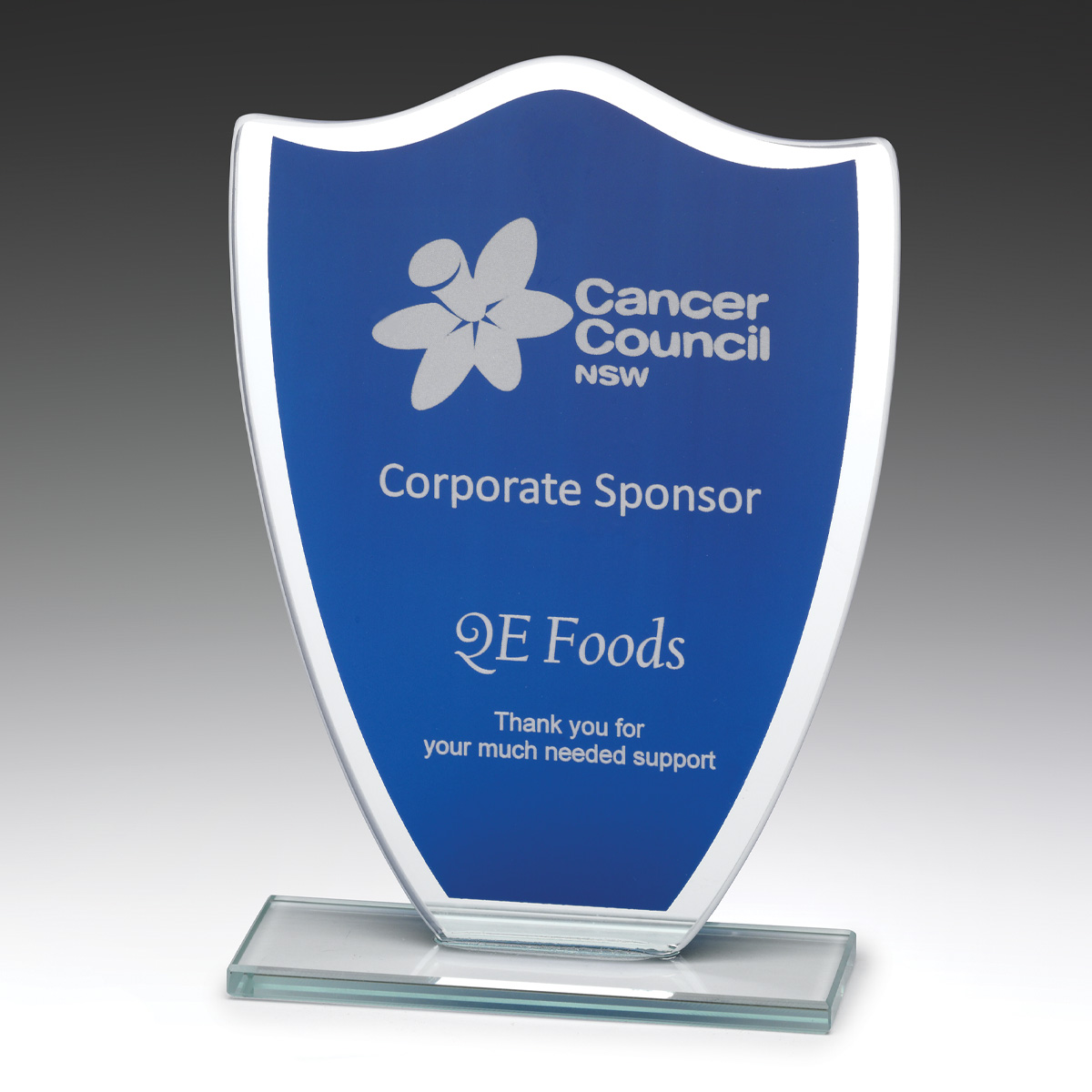 Affordable glass award - supplied in gift box - in traditional shield shape with blue panel for your engraving requirements. Part of the range of budget glass awards for you to consider.