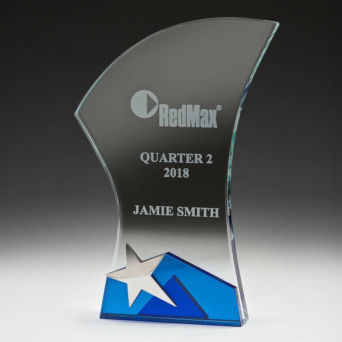 Exciting design provides your award winner with a brilliant alternative. Crystal features vibrant blue colour and star metal accent. Available in 2 sizes - supplied in gift boxes.
