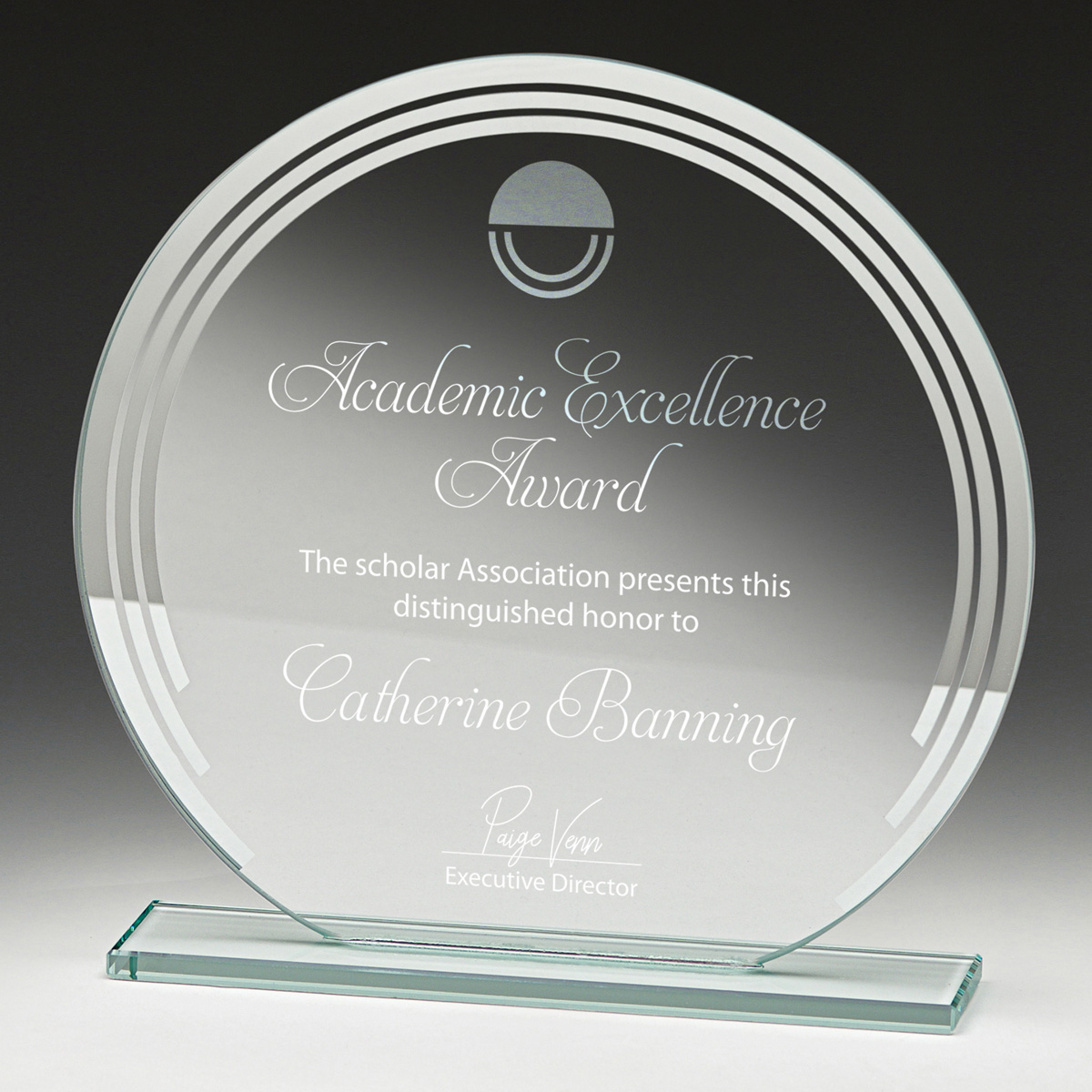 The Halo budget glass award series presents ample space for your engraving framed by silver highlights over various sizes.