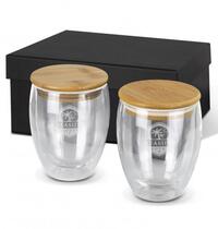 Stylish 250ml double wall, shatter-resistant borosilicate glass coffee cup featuring a natural bamboo lid with a silicone seal. Azzurra is presented in natural kraft gift box with NATURA branding.