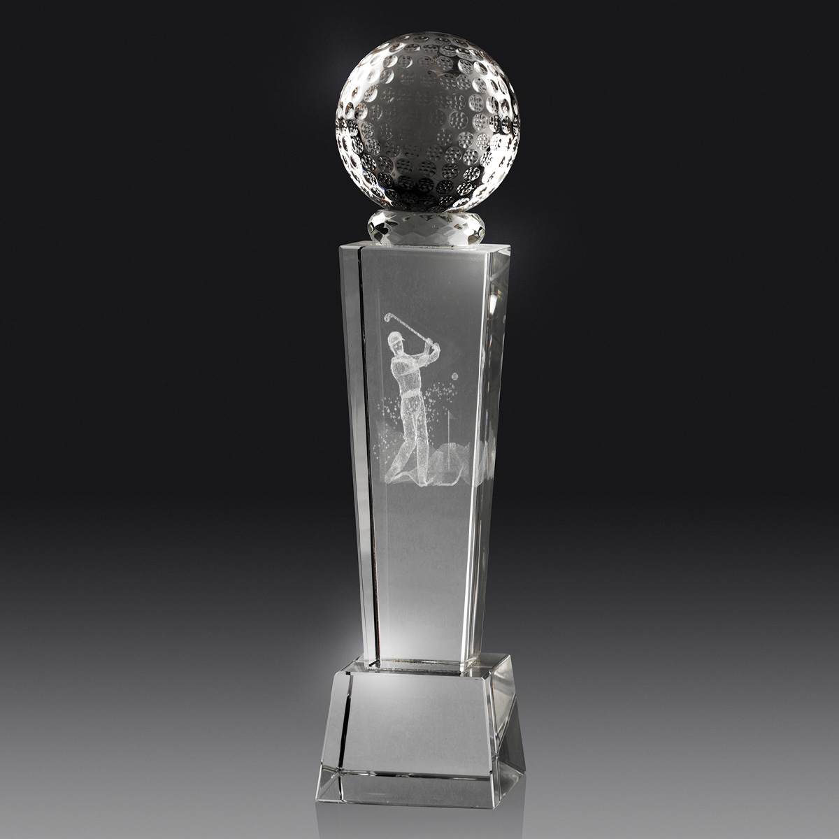 Brilliant golf crystal award in 2 great sizes showcases a 3D crystal golf ball atop the elegant tower structure. The design features a precise golf scene hologram that elevates this prestige trophy series. In presentation gift box.