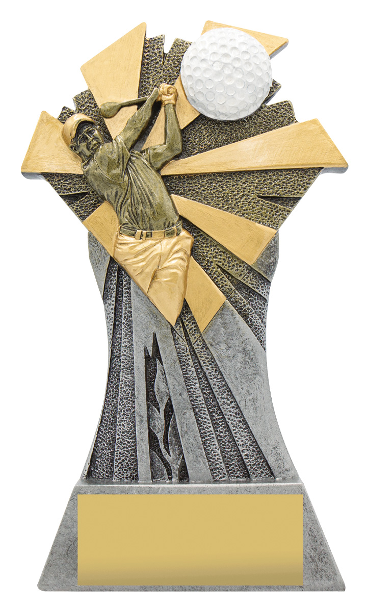 The Smash Series for Golf is a substantial award, a sculptured trophy line featuring a golf player and a golf ball in motion against a dynamic backdrop. Finished in gold and silver and available in 3 great sizes.