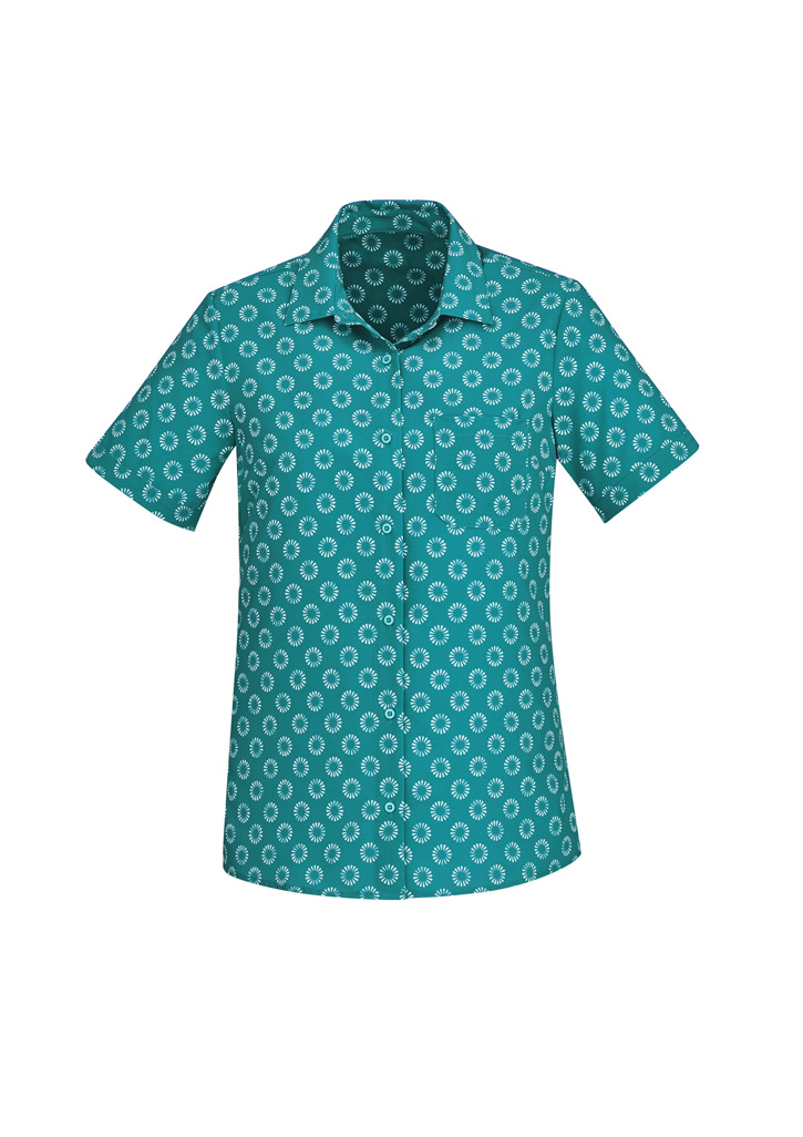 Styles feature longer hem lengths, hidden bust button on short sleeve style, side splits and pocket.