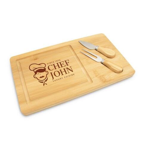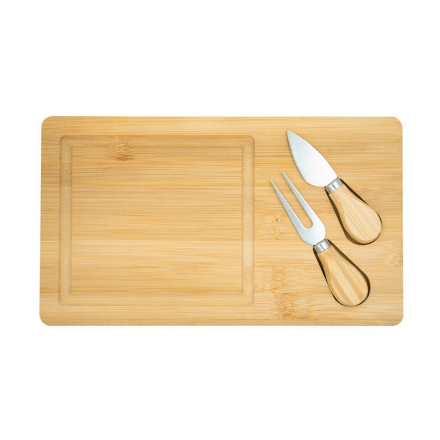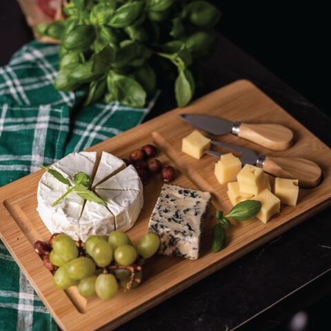 Eco-friendly bamboo cutting board | Includes stainless steel cheese knife and fork with bamboo handles | Durable, natural, and stylish | Perfect for entertaining and serving | Compact and easy to store | Ideal for gifts, home use, or picnics