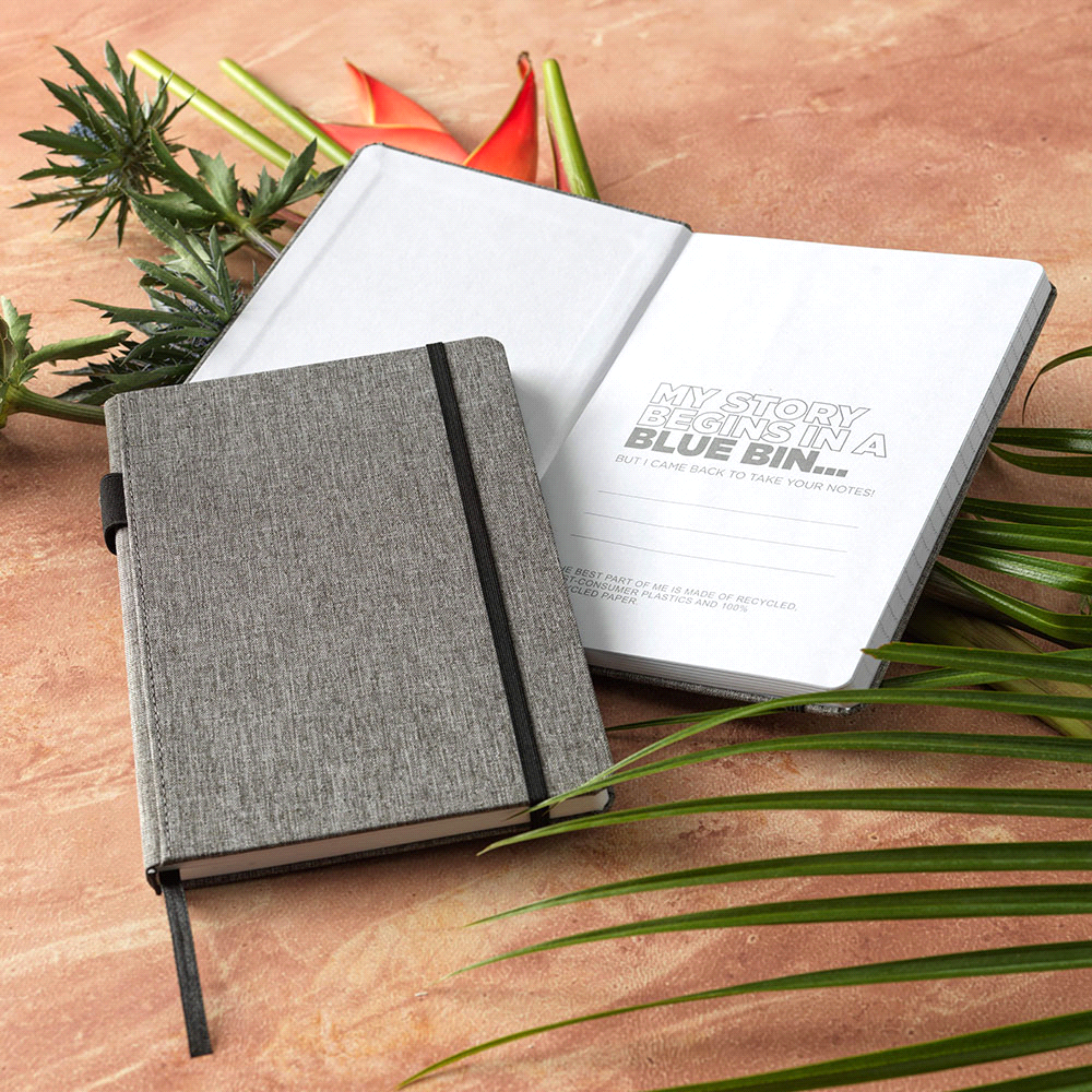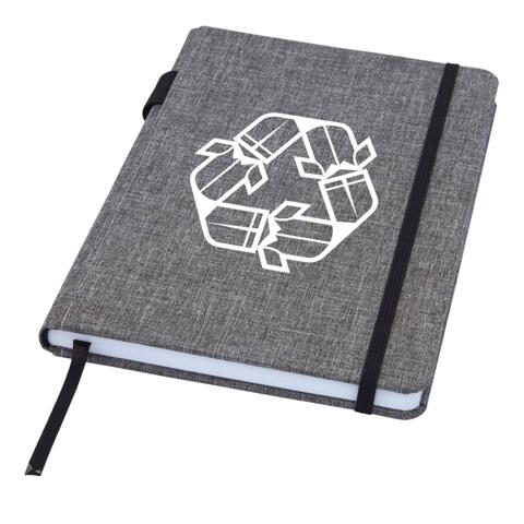 Product DetailsProduct Details FeaturesFeatures 96 white sheets of 70 g/m recycled paper with a lined layout, a pen loop, and a ribbon marker. ColoursGrey Size145mm(w) x 215mm(h) Decoration methodTransfer - One Colour / Transfer - Full Colour / Extras / Sticker MaterialRecycled plastic Shipping InformationShipping Information PackingIndividual recycled cardboard sleeve Carton quantity40 pieces Carton weight13 kgs Carton height39.5 cm Carton width32.5 cm Carton depth24.5 cm