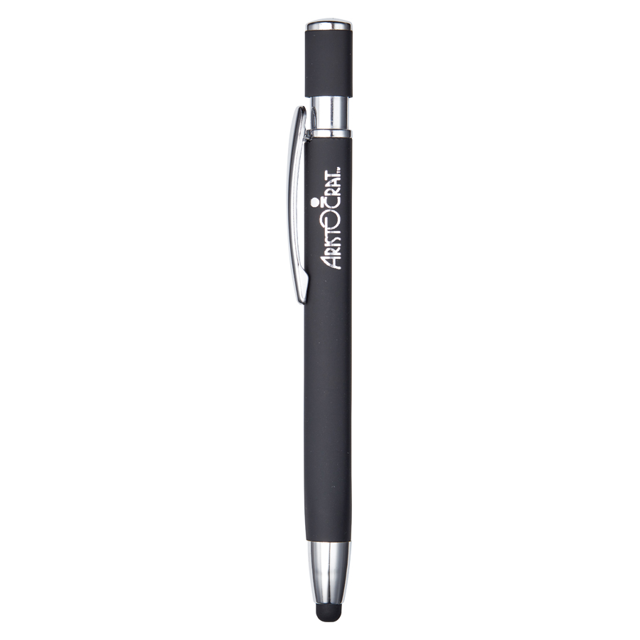 This click-action metal pen features a unique rubberised finish and comes with black ink for smooth writing. It also includes a matching stylus tip for easy navigation on devices. Each pen is engraved to reveal a striking matte finish, offering a 500m writing distance—perfect for long-lasting use.