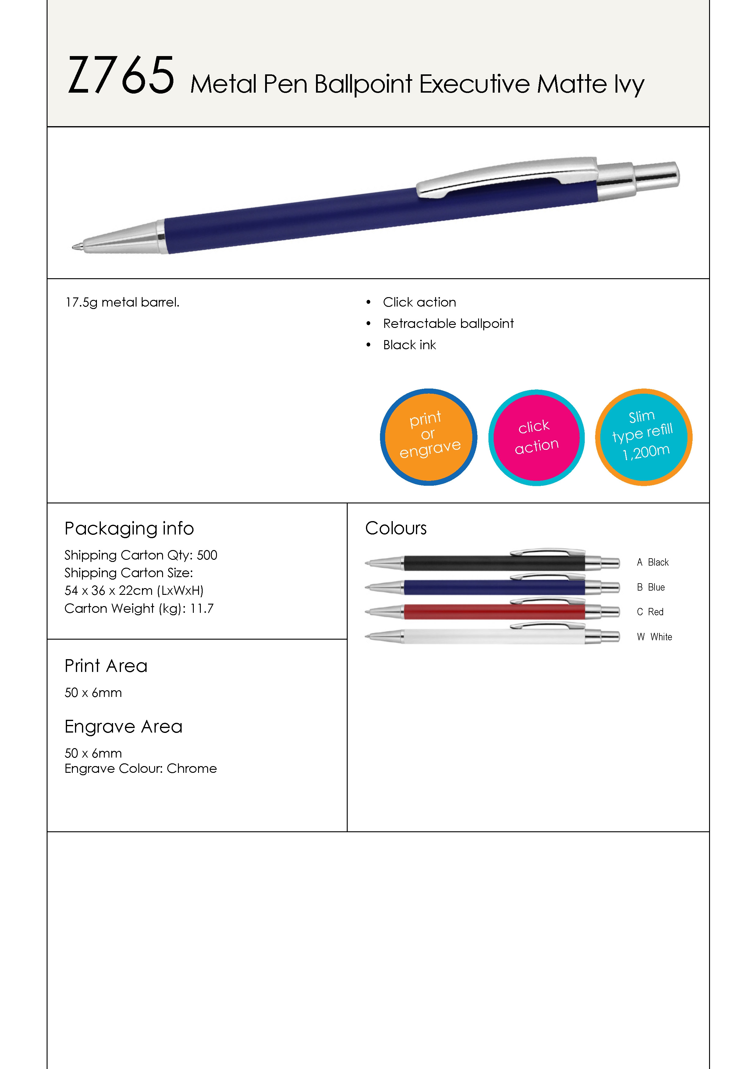 Product DetailsProduct Details FeaturesPush button, retractable ballpoint - black ink Engrave colorMirror Chrome Finish Shipping InformationShipping Information Carton quantity500 pieces Carton weight10 kgs Carton size36 cmW x 22 cmH x 54 cmD