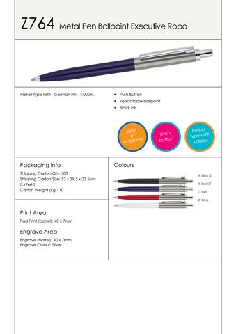 Product DetailsProduct Details FeaturesPush button, retractable ballpoint - black ink Print areaPad Print (barrel): 40 x 7mm Engrave area40 x 7mm Engrave colorSilver Shipping InformationShipping Information Carton quantity500 pieces Carton weight10 kgs Carton size39.5 cmW x 23.5 cmH x 53 cmD