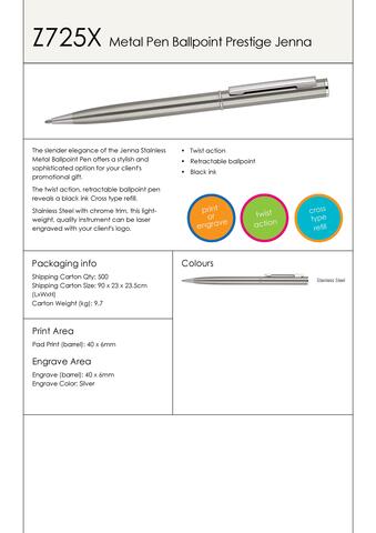 The slender elegance of the Jenna Stainless Metal Ballpoint Pen offers a stylish and sophisticated option for your client's promotional gift. The twist action, retractable ballpoint pen reveals a black ink Cross type refill. Stainless Steel with chrome trim, this light-weight, quality instrument can be laser engraved with your client's logo.
