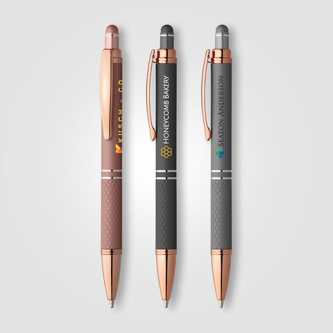 The rich mineral barrel colours with colour-matched stylus, rose gold trim, chrome rings, and a diamond patterned grip all come together to lend detailed elegance to this trendy giveaway. The soft finishing touch, making this pen truly noteworthy. Customise with silver laser engraving on the barrel for long-lasting visibility. Get your brand the attention it deserves on this super stylish retractable stylus pen.
