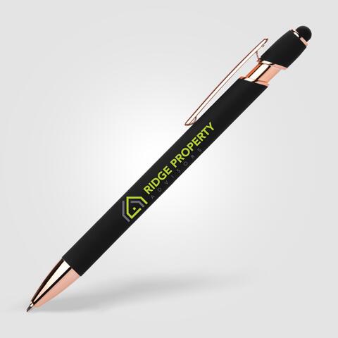 The Prince Softy Rose Gold w/ Stylus is a stylish, premium pen with trendy rose gold trim, available in your choice of black or blue medium ballpoint ink. Available in a range of top-selling classic barrel colours, all with rubberized soft touch finish plus a stylus that's perfect for touchscreens. Our precise silver laser engraving will showcase your company name, logo or advertising information. This beautiful promotional pen will be a favourite of your customers!