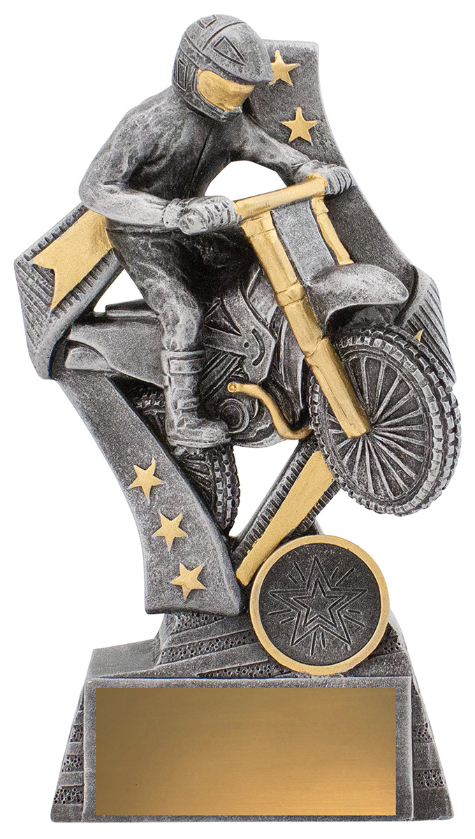 Dynamic Motocross trophies well suited to range of events. These 'Flag' bike trophies feature a stylish star based design with a rider in action.