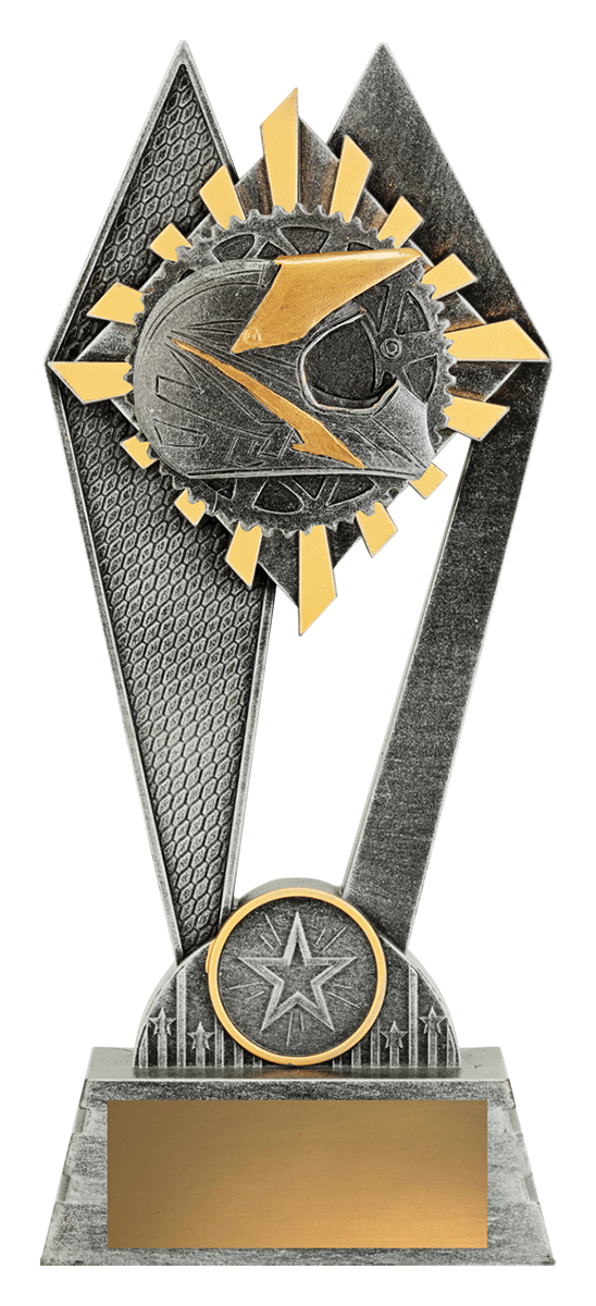 The Peak Series is an innovative set of trophies offering super value for such an impressive size range. An elevated design that showcases the distinct Motocross helmet against vibrant sunray background. Available in 3 sizes.