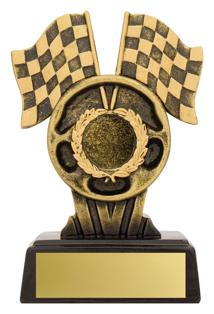 Effective design, in 3 convenient sizes and space for 25mm insert. Budget motorsport trophies featuring a design made up of the victory flags and steering wheel. Finished in traditional antique gold colour scheme.