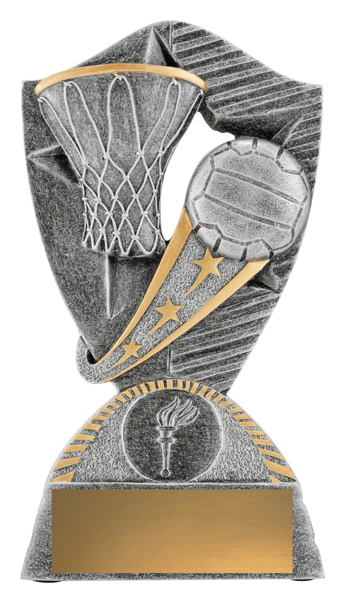 Brilliant netball trophy for your team or club. The Gambit offers a dynamic theme in antique silver & gold - space for your custom logo.
