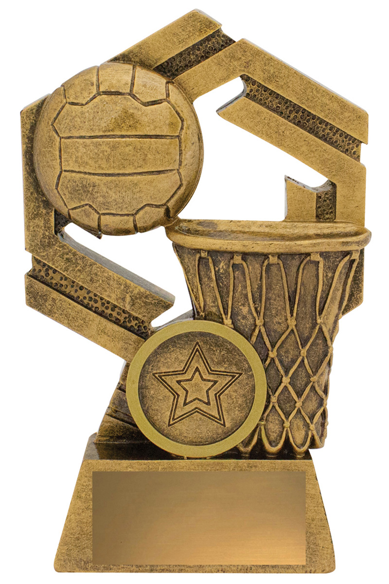 Eye-catching design that features classic netball elements of ball and net. Netball trophies finished in traditional antique gold with space for custom insert.