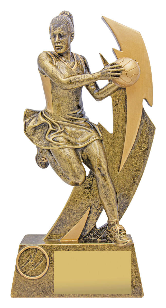 Netball Shazam Trophy Series showcases the netball player with excellent detail and is completed in classic trophy gold colours. With 5 sizes, series of netball trophies perfect for your club or team award presentation. Ideal for your best player awards.