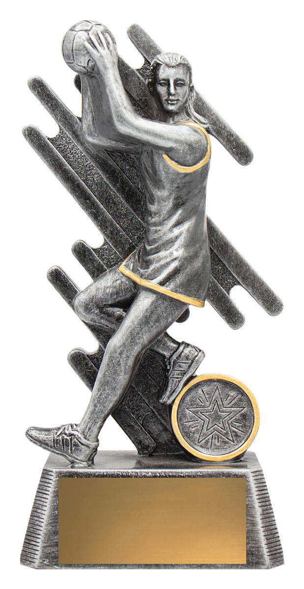 Zoom Series showcases Netball player in action against a stylised backdrop and finished in classic antique silver. Available in multiple sizes and includes space for custom logo.