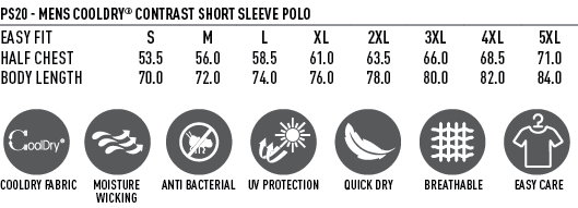 Product DetailsProduct Details FeaturesCoolDry Raglan Short Sleeve Contrast Colour PoloFabric: CoolDry® Mesh 165gsm - 100% Polyester . Description: Breathable diamond knitted fabric. Short raglan sleeves. Contrast piping on raglan sleeve seams and on collar. Available coloursBlack/Gold|Black/Lime|Black/Red|Black/White|Bottle/Gold|Charcoal/Orange|Maroon/Gold|Maroon/White|Navy/Gold|Navy/Red|Navy/White|Red/White|Royal/Gold|Royal/White|Skyblue/Navy|Stone/Black|White/Navy Sizes1XL|2XL|3XL|4XL|5XL|L|M|S Available decorationEmbroidery|Screen Printing Size chartSize chart Size chart