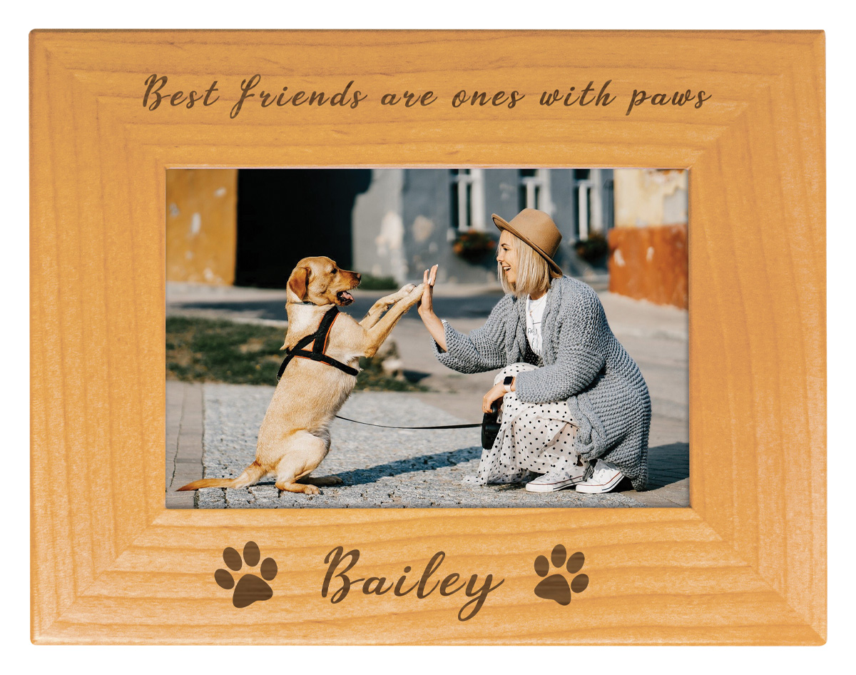 Beautiful wood photo frame makes an excellent gift idea. Request engraving to make this a truly personal memento. Photo protected by glass lense. Hang or stand vertically or horizontally.