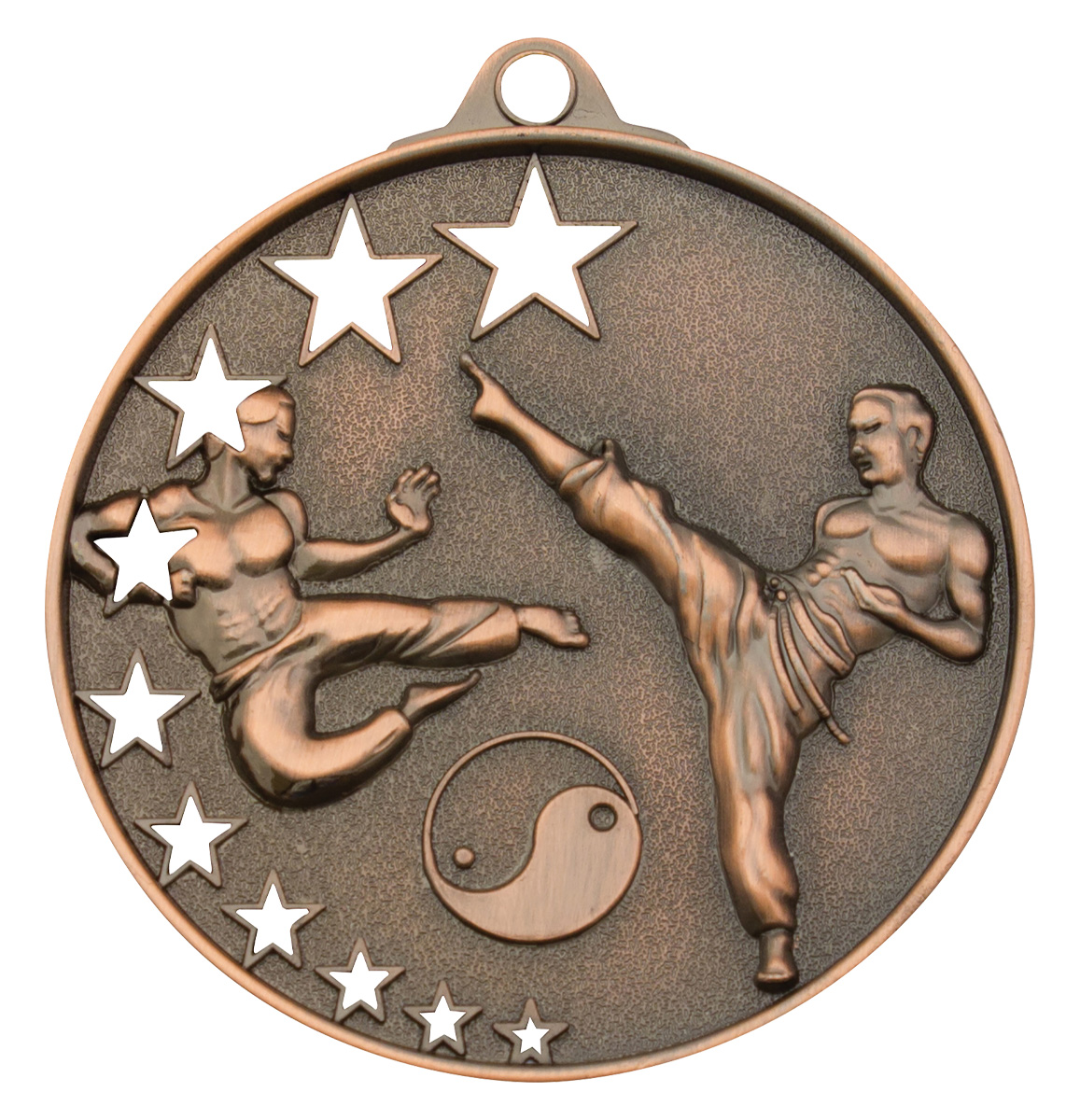 Bright gold, silver and bronze medals for Karate and Martial Arts. A popular medal series, the Star Series features a unique hollow multi-star design and extra thick edge. There is a rectangle panel on the back of each medal for your engraving. Ribbons available in all colours and plenty of medal boxes to suit.
