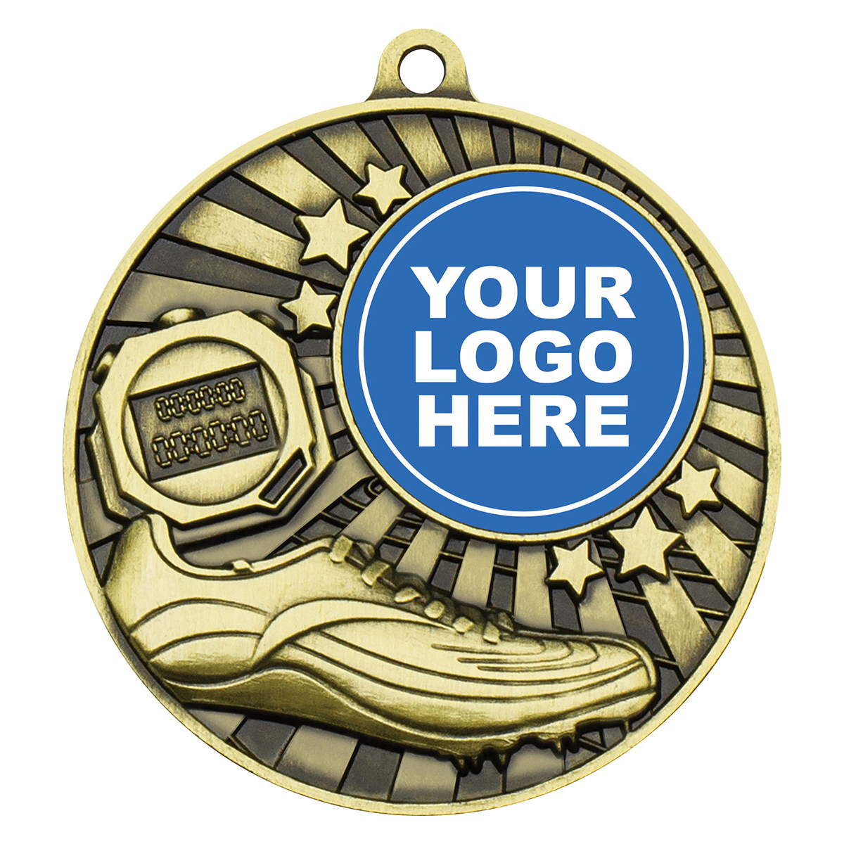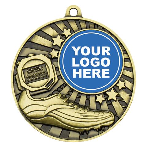 Brilliant athletics medals features iconic elements of track shoe and stop-watch while retaining central space for your custom logo to celebrate your club.