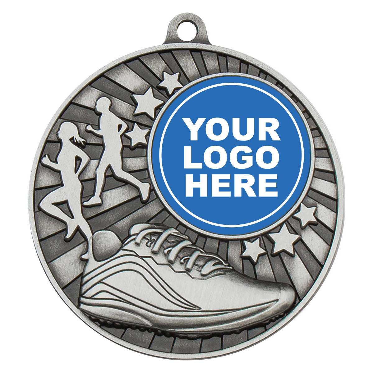 Brilliant running medals for cross country and long distance events feature central space for your custom logo to celebrate your event.