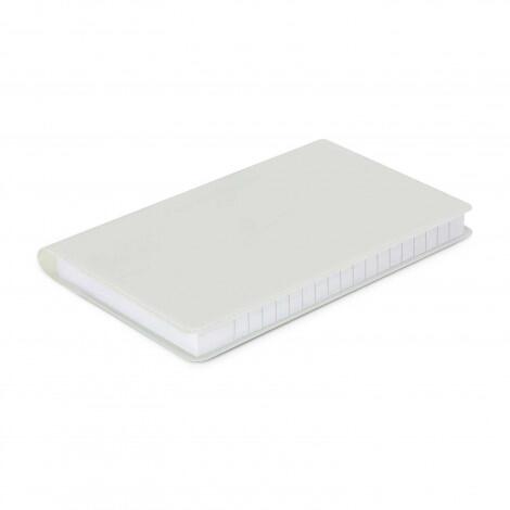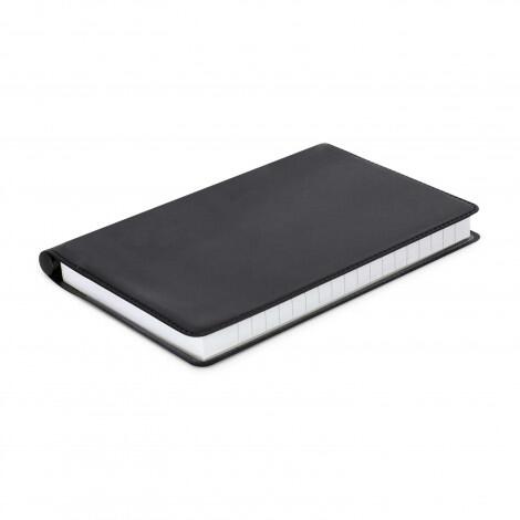 Small pocket-size (approximately A6) notebook with a flexible vinyl cover and 70 leaves (140 pages) of lined paper. It is supplied with a pencil which neatly fits into the spine.