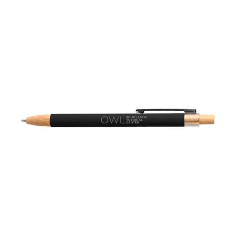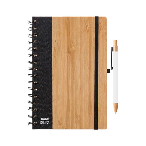 The Serenity Pen & Pacifica Notebook Set is where elegant design meets everyday practicality. The Pacifica A5 Notebook is crafted with a bamboo veneer cover and black spiral binding, housing 80 sheets of ruled recycled paper with handy date fields on each page. Subtle eco details, including a Mobius loop on every sheet and an RPET strip across the cover, highlight its sustainable touch. A black elastic strap keeps the notebook securely closed, while a built-in pen loop ensures the matching Serenity Pen is always on hand. The Serenity Aluminium Pen adds sophistication to the set with a soft-touch barrel, accented by bamboo push button and tip details, a Gunmetal Grey clip, and a clear top feature. Smooth black ink makes writing effortless, while the tactile finish ensures comfort in use. Together, the notebook and pen form a stylish and coordinated duo—ideal for meetings, note-taking, or gifting to clients and staff.