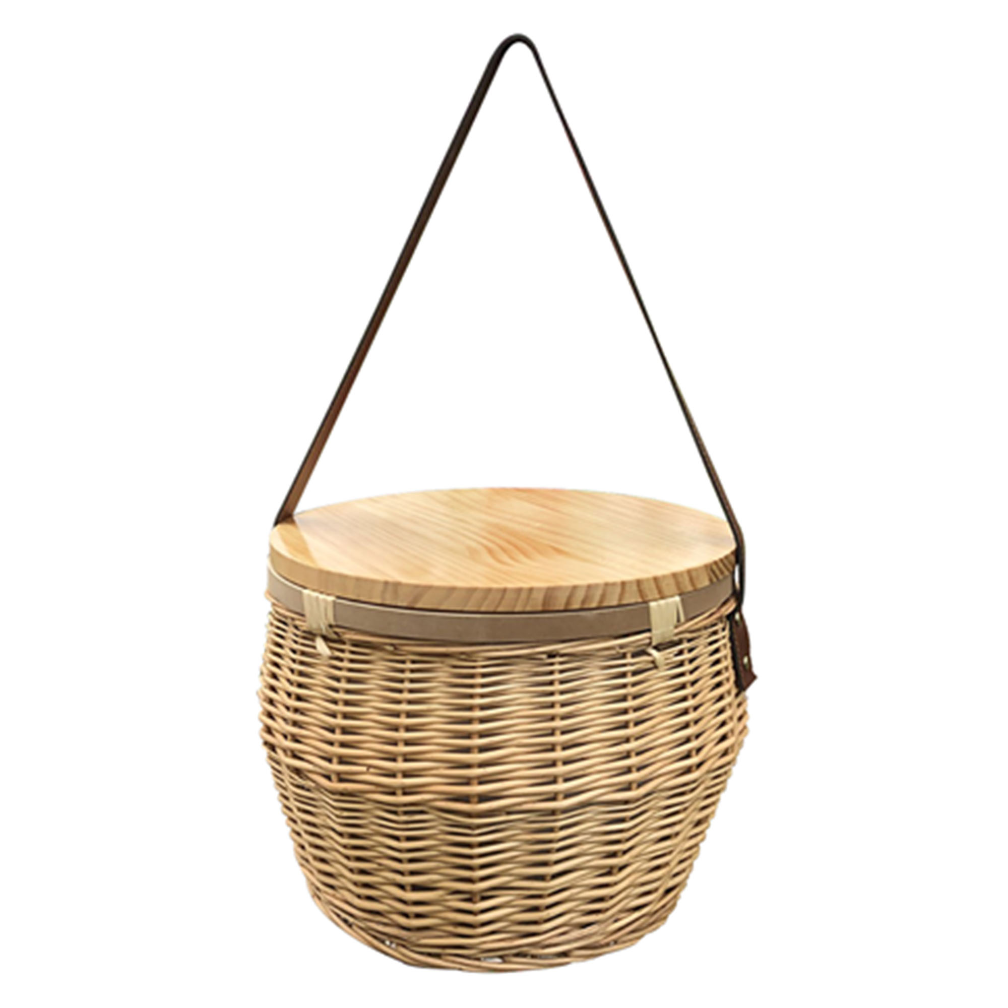 A great promotional cooler basket for any picnic and party round shape handmade wicker basket with inside insulated silver lining and a zippered canvas closure which keeps drink and food cool. The lacquered pine wood lid can be used as a small table for food and drink but not recommended as a cheese board. Each board is individually unique and they all have their own markings non of two boards will be engraved with same outcome. A quality thick comfortable leather shoulder strap makes it easy to be carried around. While the basket is handmade it may vary slightly in size and shape also with slight imperfections.