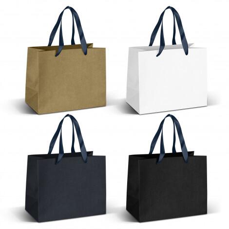 Medium-sized carry bag made from 180gsm paper with coloured ribbon handles. The gusset and top edge are reinforced for added strength.