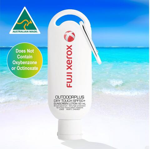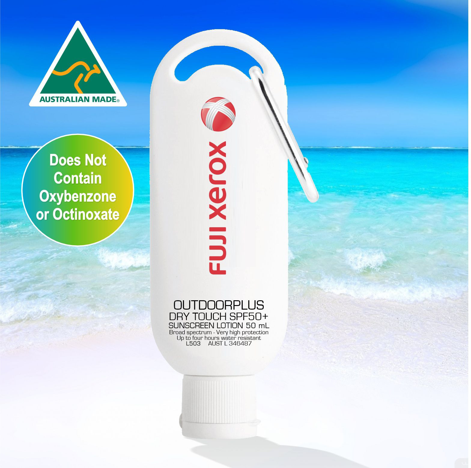 Our Sunscreen does not contain Oxybenzone or Octinoxate All the protection of our Australian Made SPF 50+ Sunscreen, with the convenience of a carabiner for attaching to keyring etc., and printed with your client's logo, this makes a great promotional or corporate gift. Unbranded orders will be supplied without carabiners attached (normally attached after printing)