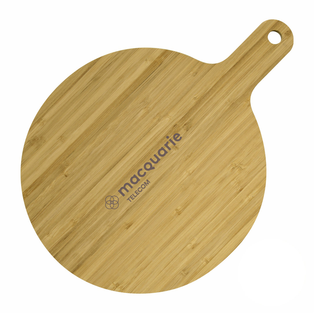 Circular Bamboo serving/pizza board with handle. Supplied in recycled kraft paper gift box