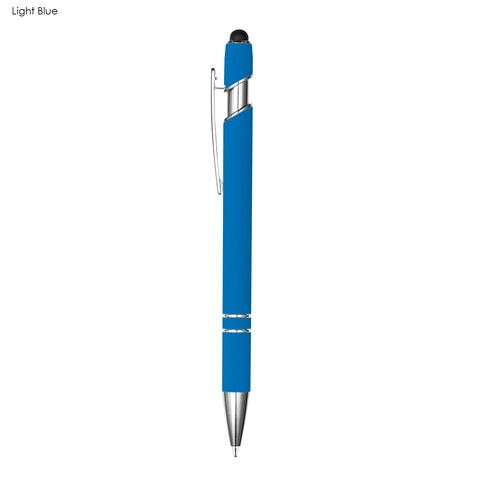 Retractable aluminium stylish design pen with a shiny silver chrome trim soft rubberised barrel in a range of colours and a stylus black top for touch screens. Click action with plastic Cross-Type German manufactured black ink refill 1200 meters writing distance tungsten carbide ball provides you with quality writing. Comes standard with black ink but blue ink is available on request at additional costs.