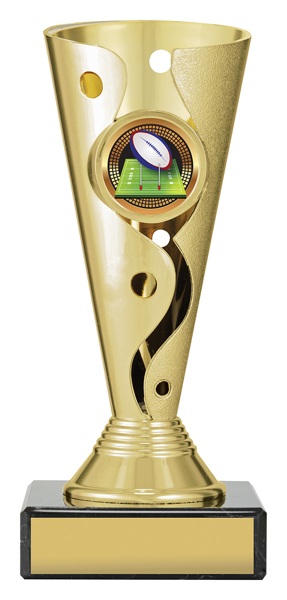Carnival cups present a distinctive cup style trophy with attractive 3D design - on classic black marble base for your engraving - with brightly coloured insert for your sport. Trophies adaptable to your custom requirements.