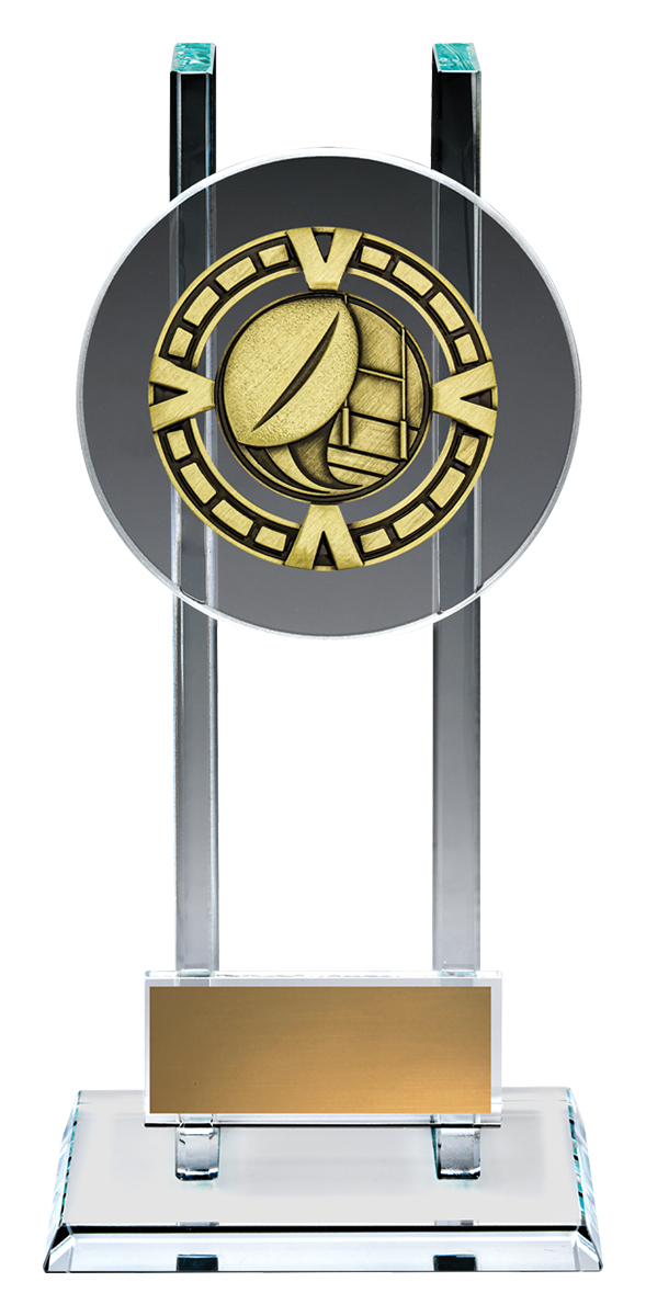 Bold glass awards are perfectly suited to recognise the top achievements at your team or club. Elevated glass platform showcases a brilliant metal theme for your sport or activity - space for your engraving as well.