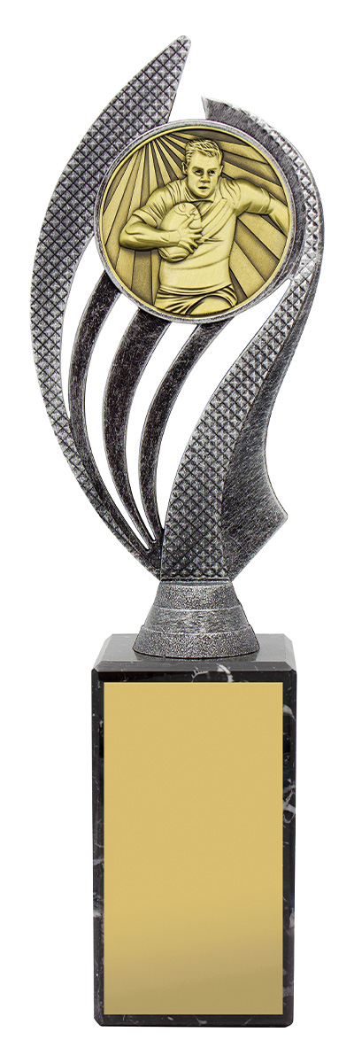Husky series of trophies on premium black marble allows for different award options for your activity. Appealing antique silver and gold combination over number of sizes.