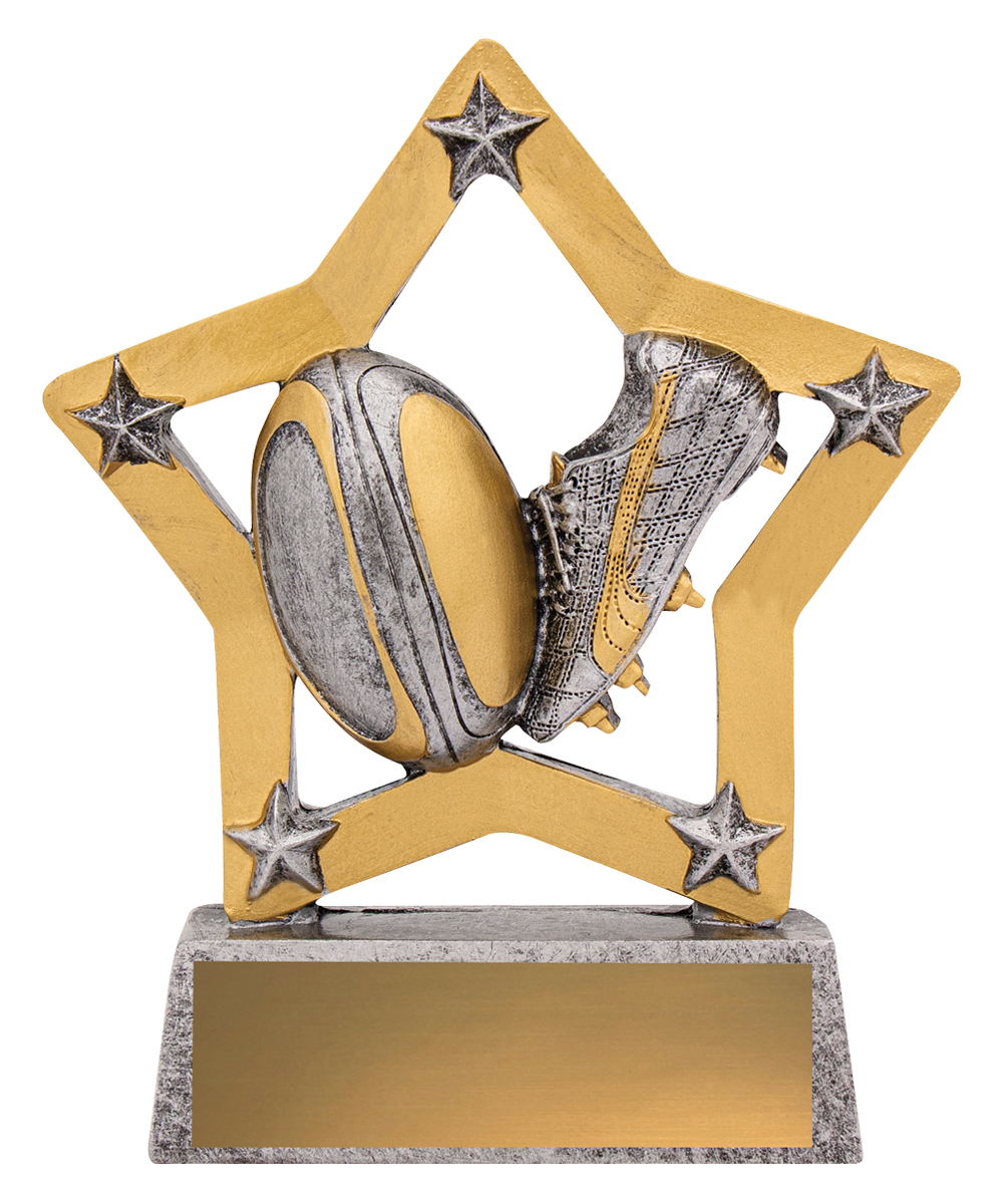Popular Mini Star trophy ideal for players of all ages and suitable for League or Union. An attractive star inspired design for your star performers. Finished in classic silver and gold colours, this award is perfect for bulk orders.