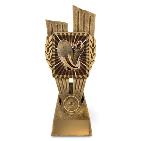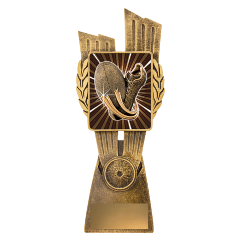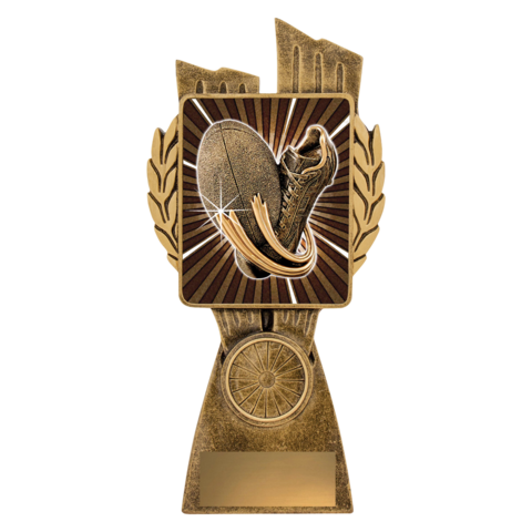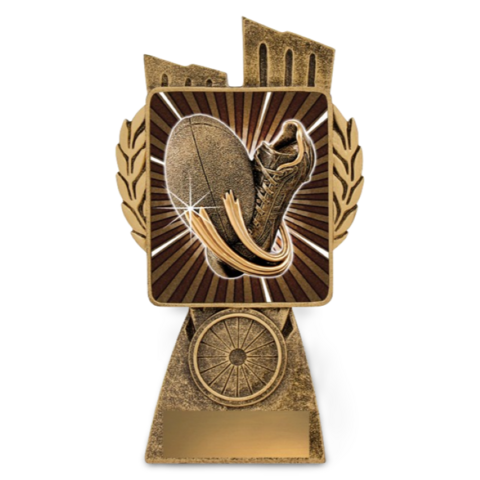 This Antique Gold Lynx Trophy is the perfect theme award for players of all ages in your Rugby League / Union club or team. Featuring a classic wreath and vibrant footy boot & ball theme design, this trophy is customisable and available in 4 impressive sizes.