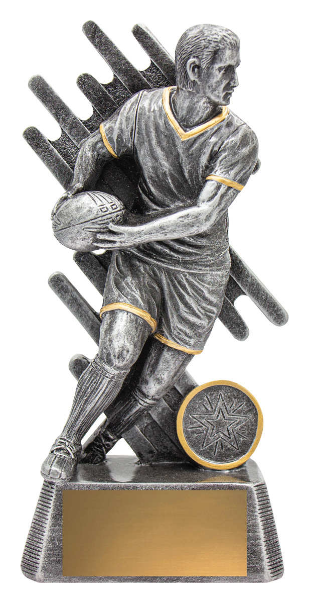 Zoom Series showcases Rugby League or Union player in action against a stylised backdrop and finished in classic antique silver. Available in multiple sizes and includes space for custom logo.