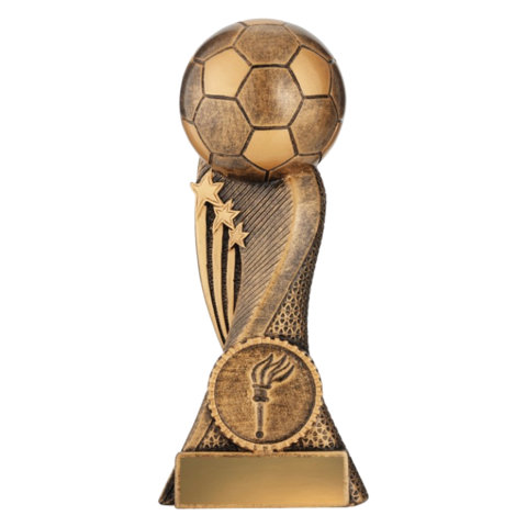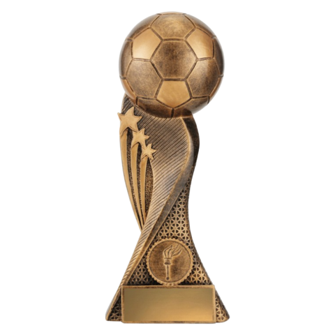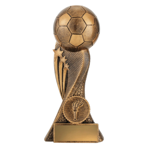 Truly impressive range of sizes for these soccer trophies – offering excellent options for budget participation, award recipients and premiership winners. Finished in traditional antique gold, the star inspired design celebrates the game with the prime, central position given to the football.