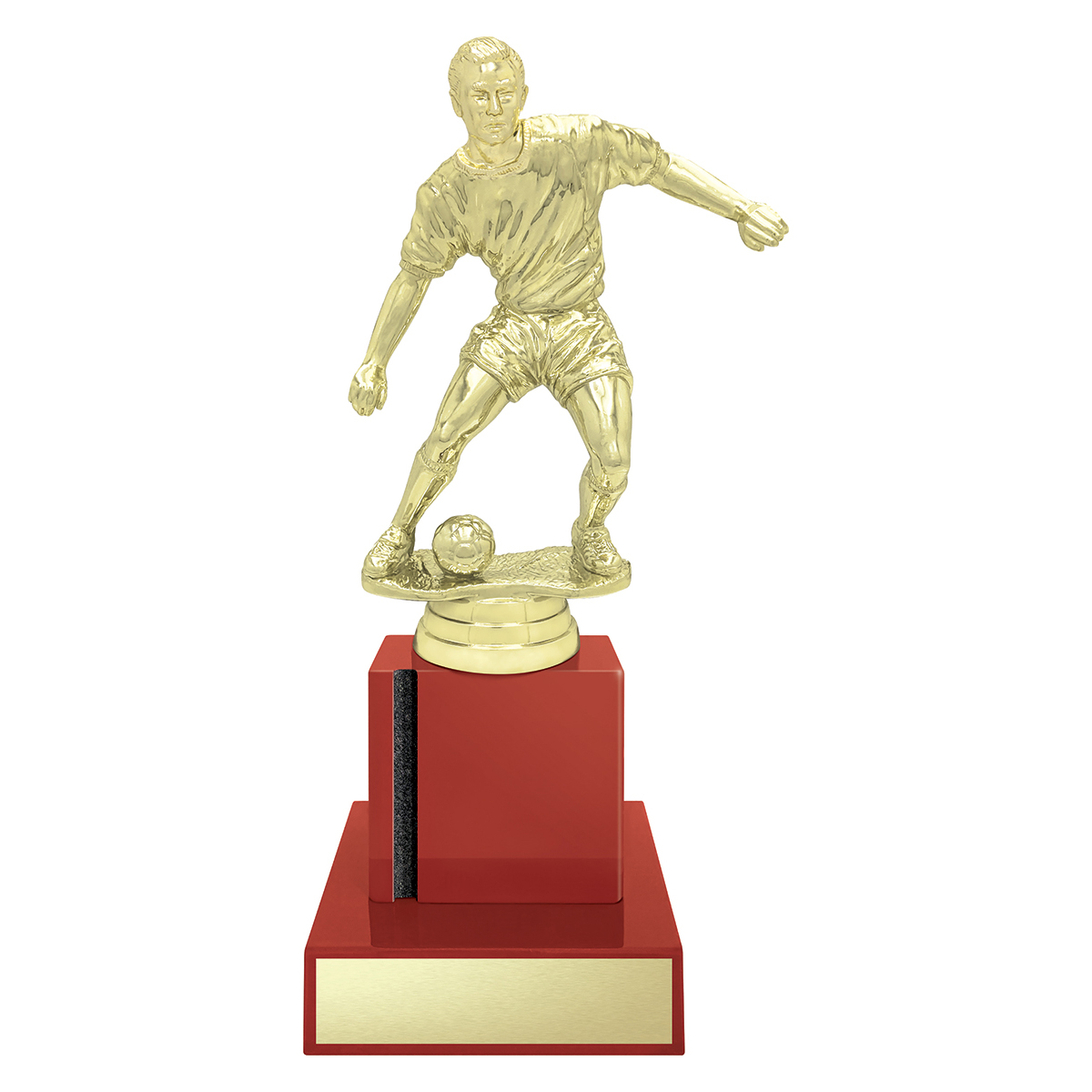 Red timber trophies feature soccer figurines - choose male or female - available in 4 sizes. Timber trophies available in different colours to suit your football team or club.