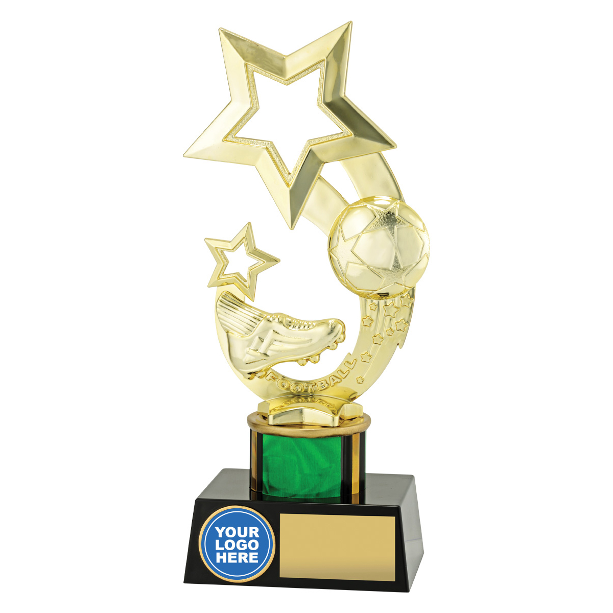 Exciting series of football trophies that features distinctive star theme top and space for your custom logo. Change colour of column to suit.