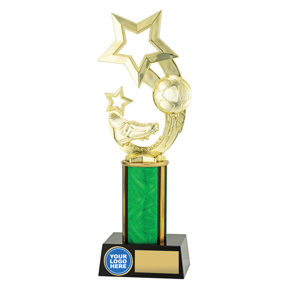 Exciting series of football trophies that features distinctive star theme top and space for your custom logo. Change colour of column to suit.