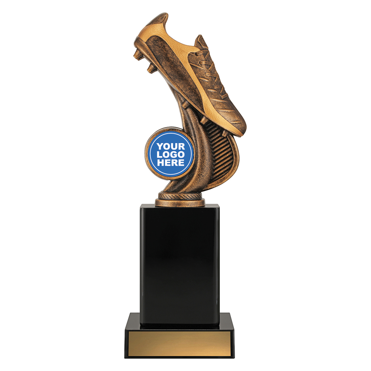 Excellent series of football boot trophies feature classic black timber and stylish antique gold top with space for your club logo.