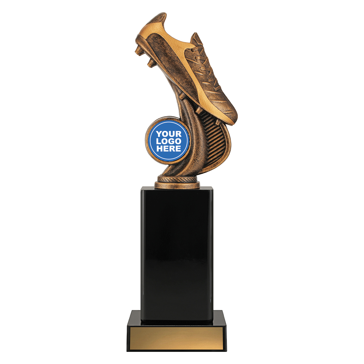 Excellent series of football boot trophies feature classic black timber and stylish antique gold top with space for your club logo.