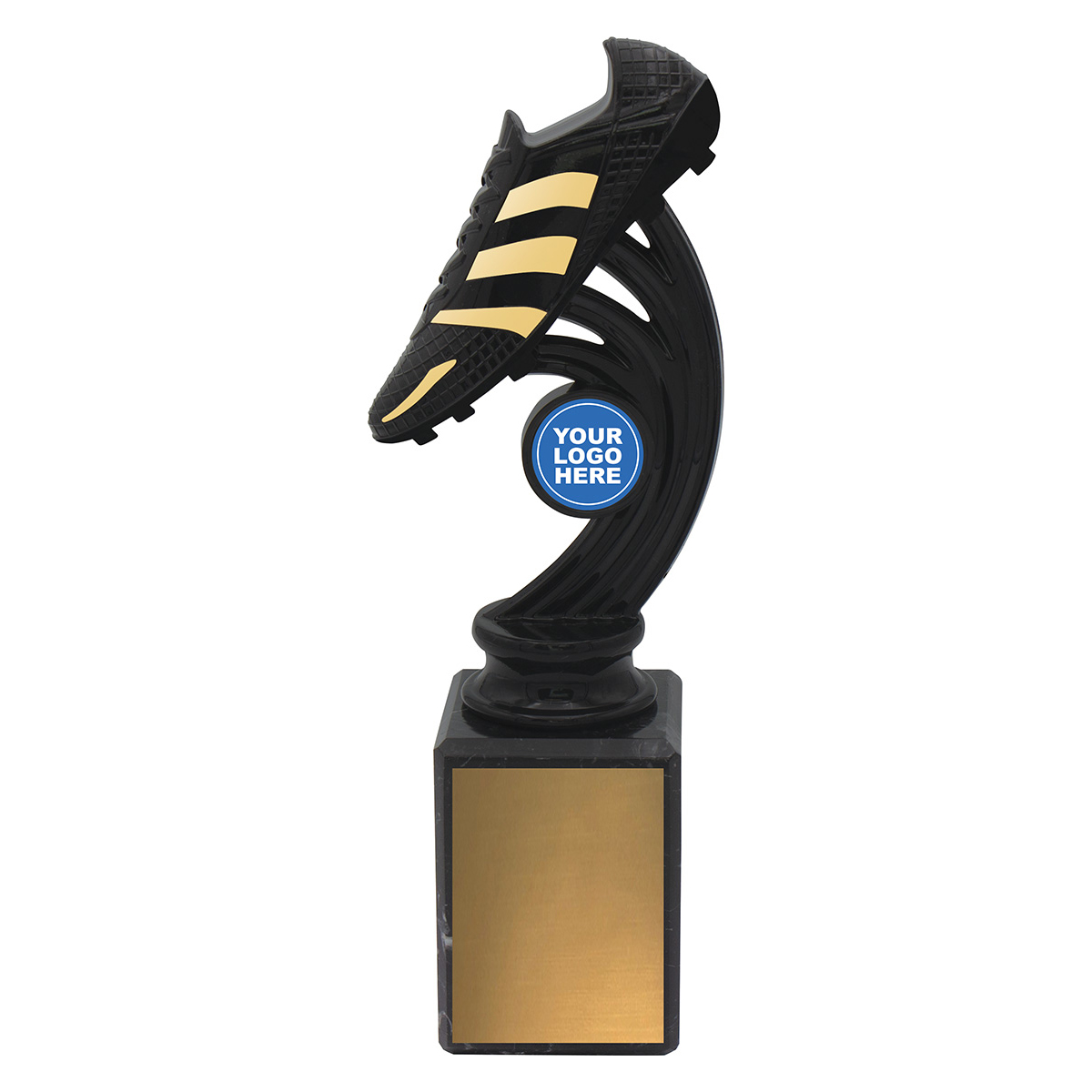Inspired series of trophies featuring a realistic boot in motion and finished in an exciting black & gold combination. Suit your club logo - multiple sizes available.