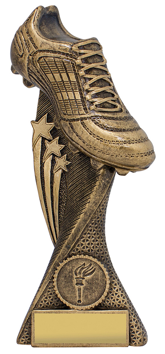 Versatile series of trophies for soccer, footy and rugby awards feature an elevated boot with superb design details, multi-star elements and position for custom insert (if required).