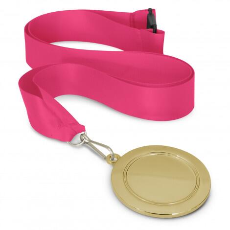 65mm diameter medal which is available in gold, silver and bronze. It can be ordered in one colour or a combination of colours at no extra cost. The medals are branded with the choice of laser engraving or a full colour resin coated finish on the front and laser engraving on the back. Each medal is supplied with a ribbon lanyard which has a safety clip and can be branded in one colour on one side. The medals laser engrave to a natural etch.